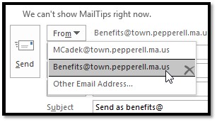 benefits@town.pepperell.ma.us is a distribution group that several employees belong to. It allows them to receive emails which are sent to benefits@ and also gives them the ability to send emails as benefits@ email account.