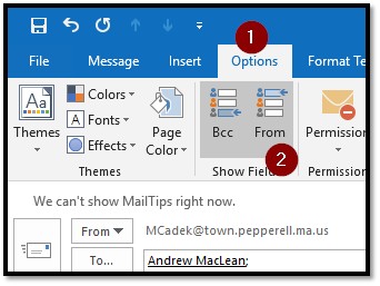 - Close that window, return to your new email message, click OPTIONS and choose the FROM field (just have to do this once, it will stay there for all future emails)